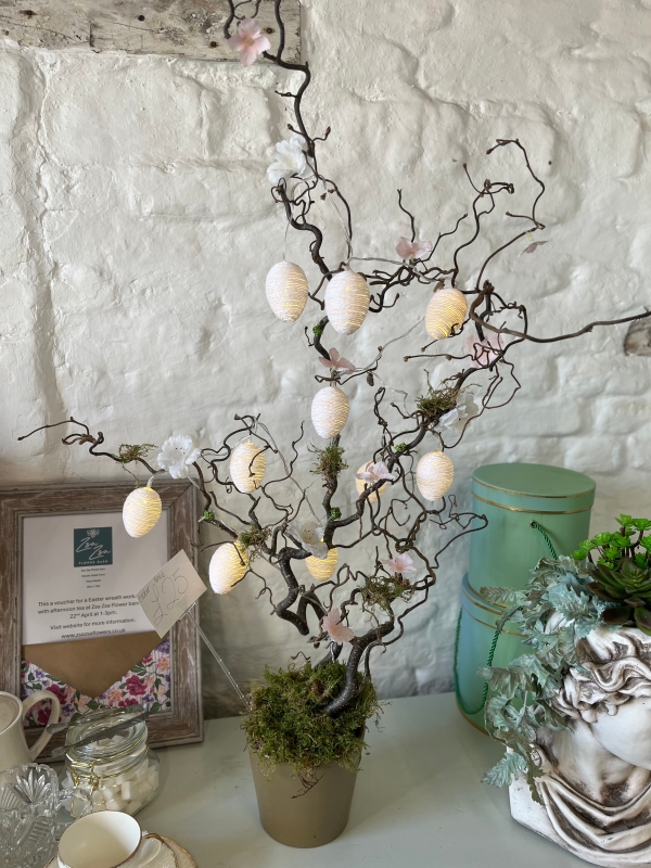 This delightful eater tree made in a lustre ceramic pot, twisted willow, moss blossom and finished with led battery rattan egg lights.