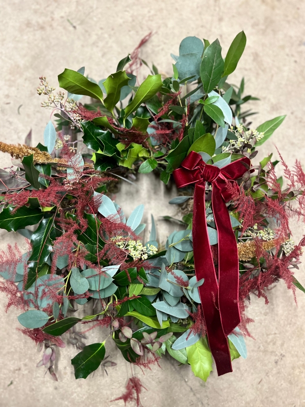 A beautiful handcrafted wreath combining lush winter foliage with soft, feathery accents in rich berry tones. Featuring holly eucalyptus, laurel and a seasonal textural green, this design is finished with a deep red velvet ribbon for elegant festive touch.
