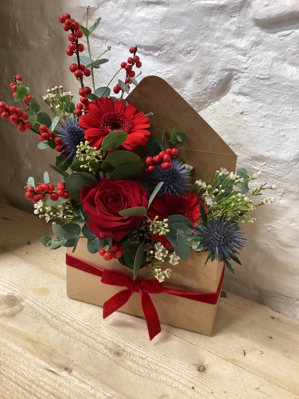 A warn delightful envelope style box filled with winter foliage thistle, berries & ruby red fresh flowers.