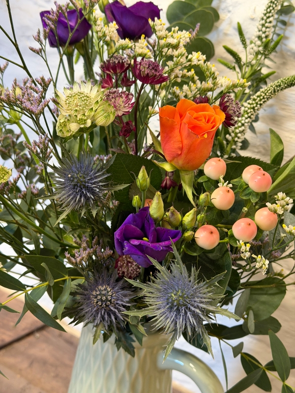 A hand picked selection of natural wild looking flowers and foliage to create a country look, presented in a ceramic jug, colours vary depending of availability on the day.
