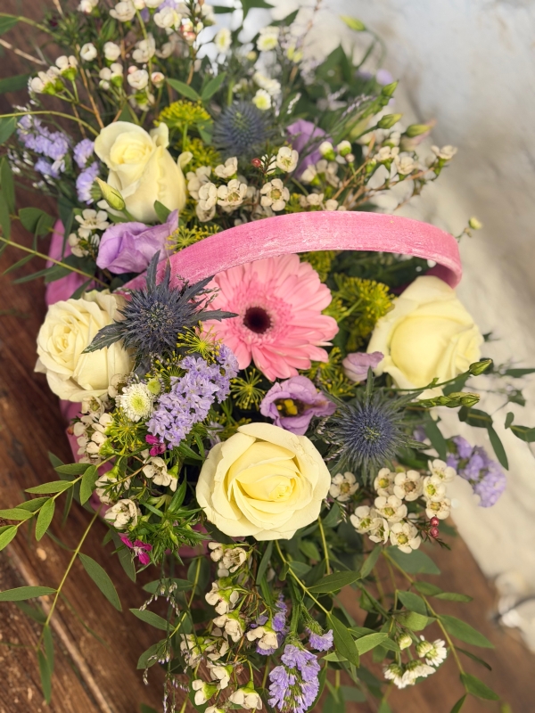 A beautifully arranged pink basket filled with soft cream roses, delicate spring blooms and fresh greenery — a gentle, elegant gift made to spoil Mum this Mother’s Day 💗🌿